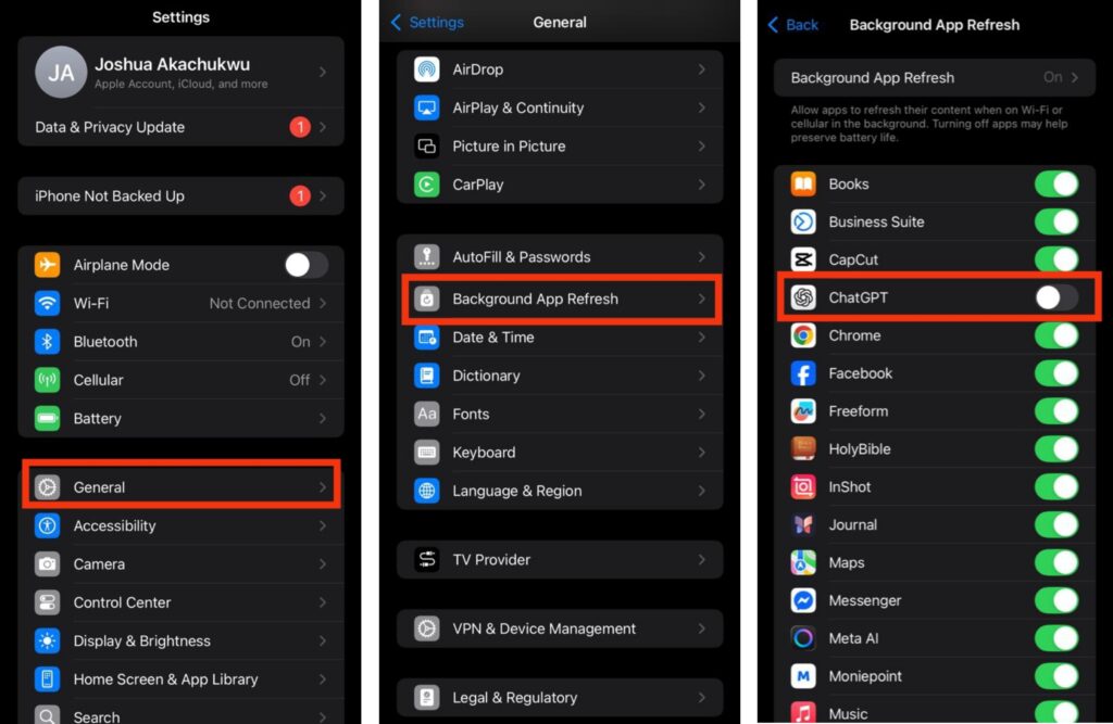 On iPhones, Background App Refresh lets apps update content even when closed. Disabling this for ChatGPT can noticeably reduce battery drain. You’ll still receive notifications, but the app won’t continuously refresh in the background.