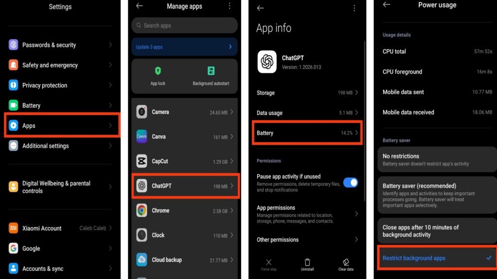 Android allows you to control how apps behave when you’re not using them. Restricting ChatGPT in the background prevents it from consuming power silently. This setting does not affect performance while the app is open; it simply stops it from running unnecessarily behind the scenes.