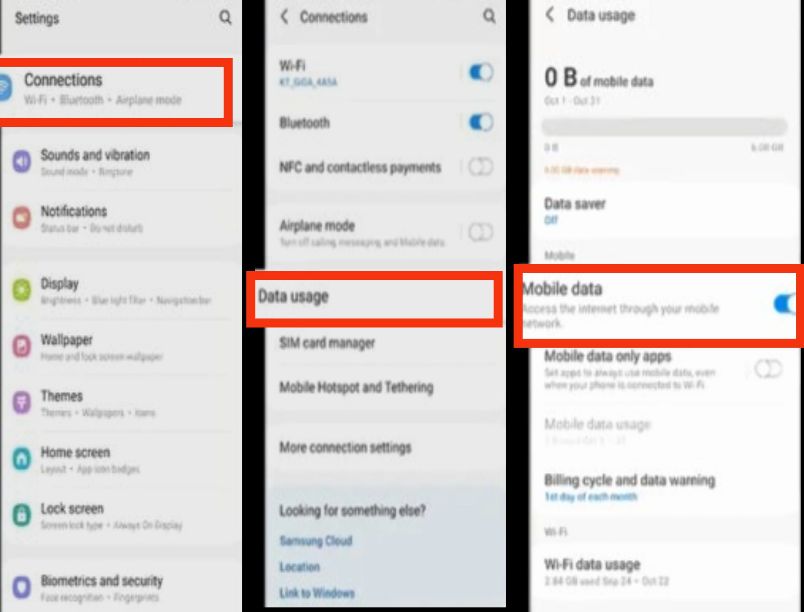Mobile data may stop working simply because the feature has been turned off on your Samsung device. This can happen accidentally, through quick settings, or when certain apps or system functions temporarily disable it. When mobile data is off, your phone cannot connect to the internet or load any online content, even though your signal and other settings may look normal. Since the data switch controls whether the device can access the network, turning it off immediately cuts off your internet connection.